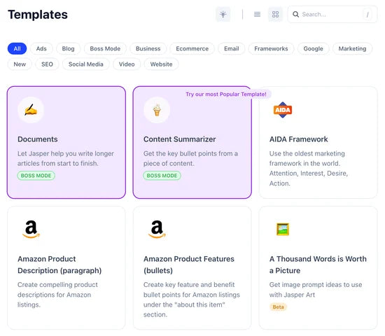 Jasper ist eine KI-Textsoftware, die speziell auf Marketing-Teams, Agenturen und Unternehmen ausgerichtet ist. Sie unterstützt bei der Erstellung konsistenter Marketing-, Werbe- und Content-Texte über verschiedene Kanäle hinweg.