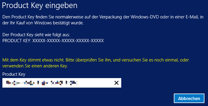 Soweit die Theorie. In der Praxis beanstandet Windows allerdings den neuen Key: Der Produktschlüssel zur Aktivierung der Testversion wird zurückgewiesen!